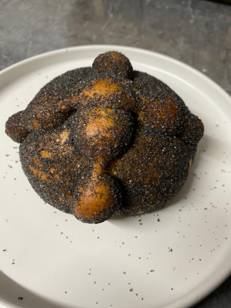 Rosetta es la panadería más fifí y pretenciosa a la CDMX. Una panadería en la que todo su pan tiene romero, para que sepa diferente y tenga el toque único de la casa. Y, aunque sus panes sí son ricos, la verdad creo que son carísimos para lo que son, y que existen muchas panaderías mucho mejores (como García Madero). Pero, es por la fama de ese lugar que tuve que asistir a probar su Pan de Muerto con cenizas de totomoxtle. ¿Y qué tal está? Bueno, por casi $70 pesos creo que es un pan bastante común. Tiene mucho sabor a naranja (yo juraría que es esencia y no ralladura, pero eso está a discusión) y poco o nada de sabor a azahar o mantequilla. Además, el romero termina apoderándose del pan, volviéndolo un pan genérico de Rosetta (podría ser cualquier pan de ahí).