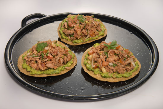 - Tostadas de Salpicón – Tostadas de salpicón de sierra ahumada con guacamole, cilantro y granos de elote