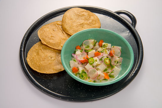 - Ceviche Cocado – Ceviche de pescado blanco con leche de coco, jengibre, chile serrano y rábano