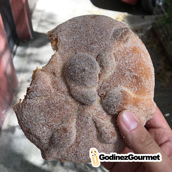 Después de pagar los $20 pesos de mi pan, lo saqué de la bolsa (lo venden embolsado) y lo probé. La verdad es que no sabía mucho a Pan de Muerto. Era un pan de mantequilla, cubierto de azúcar con canela, lo que hacía que todos los demás sabores se pierdan. No me malinterpreten, era un pan muy rico, pero no sabía mucho a Pan de Muerto.